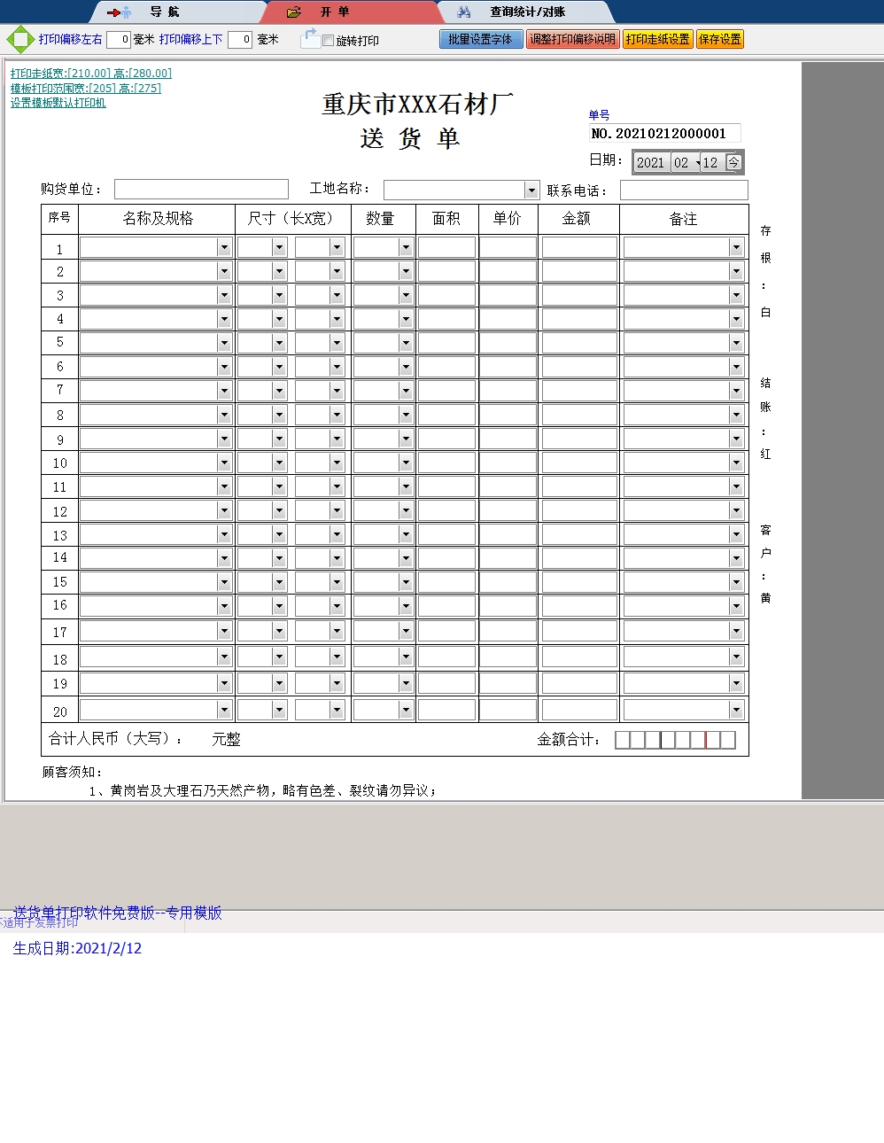 1今晨送货单打印软件集送货单管理,产品资料库管理,客户资料库管理,月结对帐单单管理,数据分析,图表分析为一体,货单号由系统自动生成2开博送货单打印软件具备完善的单据查询数据汇总数据统计分析功能,拥有对账单功能,统计客户销售额已付款未付款等功能3万通送货单打印软件可以自主。