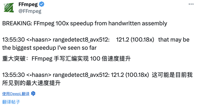FFmpeg 就是少数仍在广泛使用汇编代码的“忠实用户”之一。他们坚持在性能瓶颈处用汇编“手搓优化”,效果往往比现代编译器自动生成的指令更高效,甚至“拉开好几个数量级”。