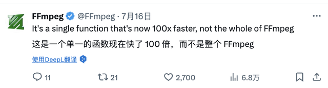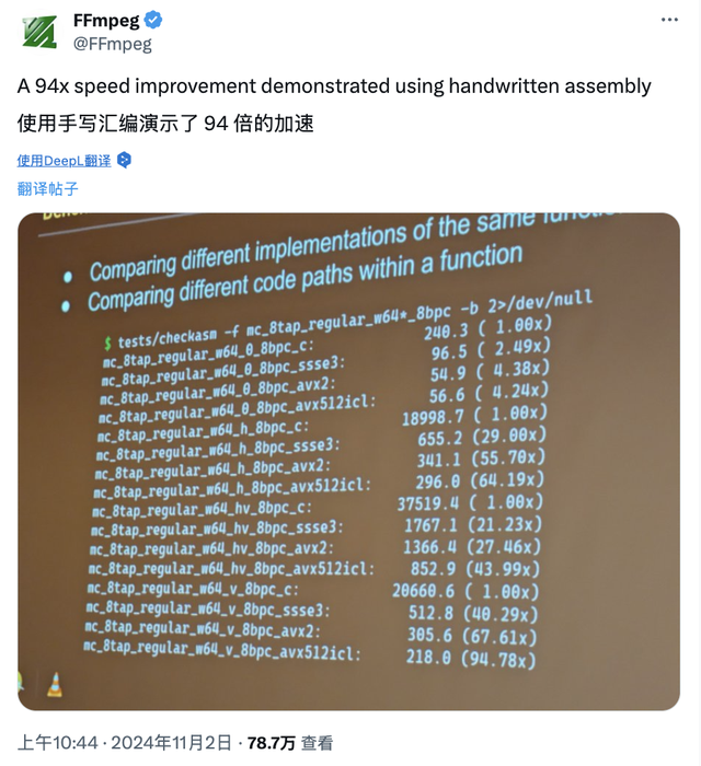 这一点在他们的实际成果中体现得淋漓尽致。2023 年 11 月,FFmpeg 项目曾有一次类似的性能突破,当时某些操作速度提高了 94 倍。