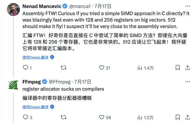 正因此,FFmpeg 在项目推文中对现代编译器提出了直言不讳的批评——“编译器的寄存器分配器太拉垮了。”