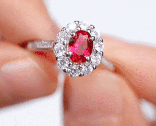采用经典的椭圆切工,带三角形刻面, 红宝石的火彩鲜艳如火,明艳动人。