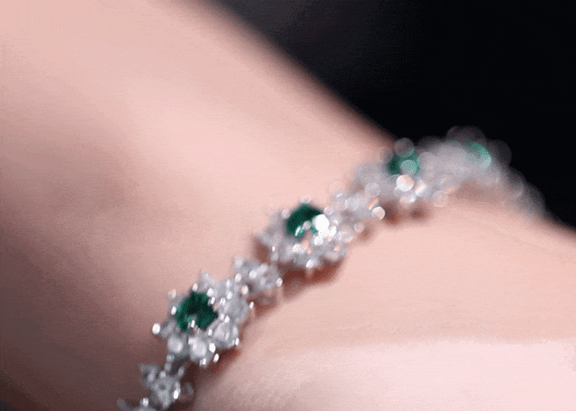 颗颗椭圆切工,折射出祖母绿的选礼宝石光彩 ,同时花朵的锆石镶嵌,光下火彩闪耀,此起彼伏,缤纷夺目,瞬间俘获我的心!