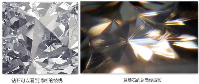 莫桑钻的硬度为9.25,它宝石棱线是有重影的,也就是刻面棱重影的特点,光线可以得到更多的散射和视觉上的“炫彩感”。