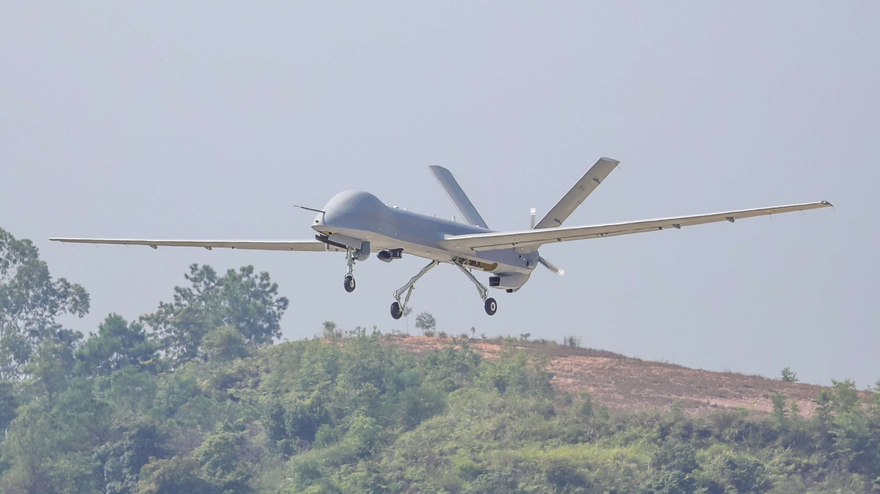 13、在5000米高空平稳飞行两小时后,机身标有“国家应急测绘”标识的LH一07号彩虹4中航时固定翼无人机在云南省怒江州兰坪丰华机场。
