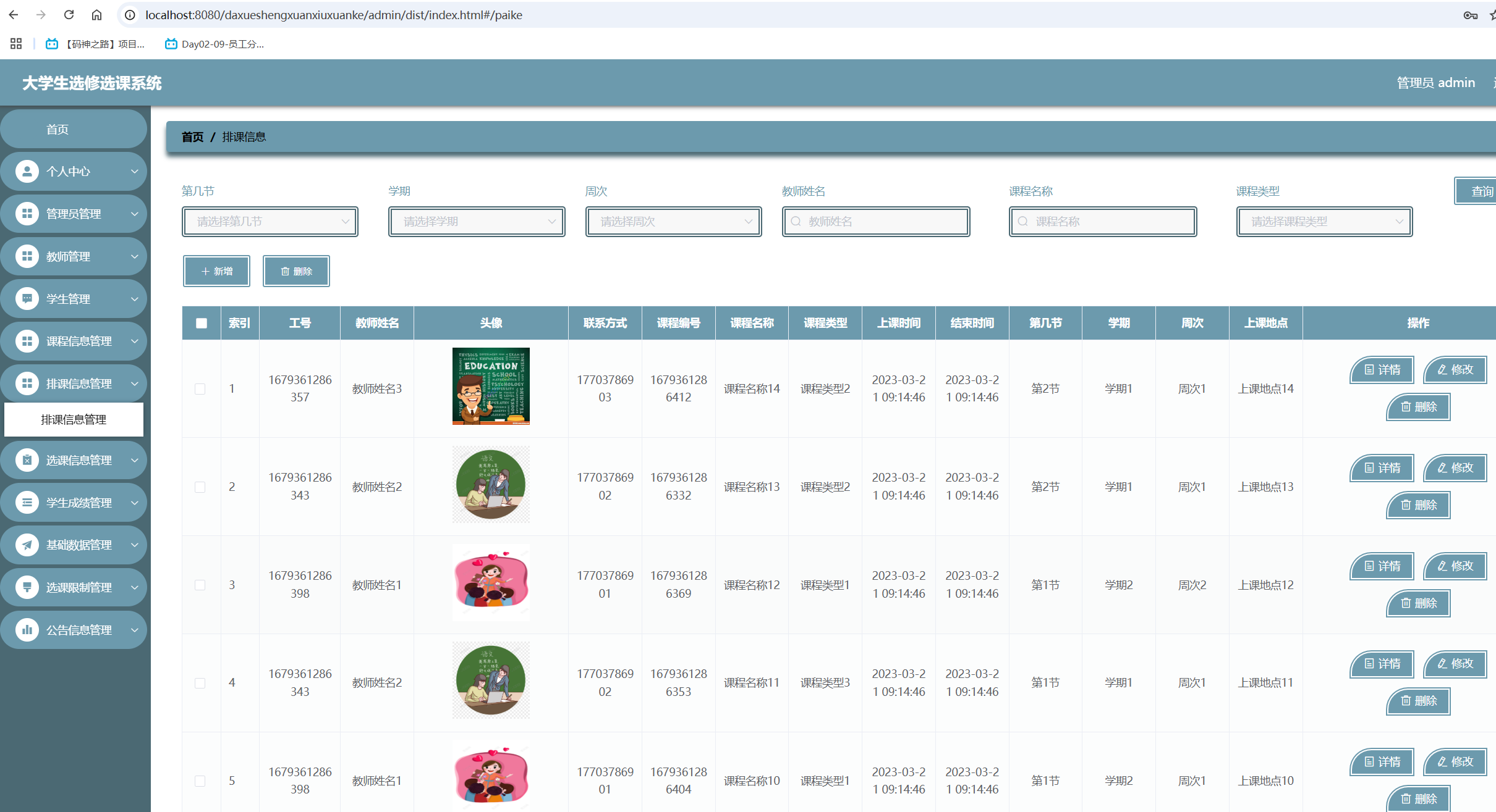 传统的行政班教学,学生课程固定,没有选课的必要,学校教务部门只需按要求排出课表以前,学校手动排课,常常桌上地上都是课程卡片,排完全校的课表需要一周甚至更长的时间随着互联网技术的发展普及,市面上出现了专门的排课软件,如51智能排课水晶排课彩蝶排课等,运用较为先进的算法,大大。
